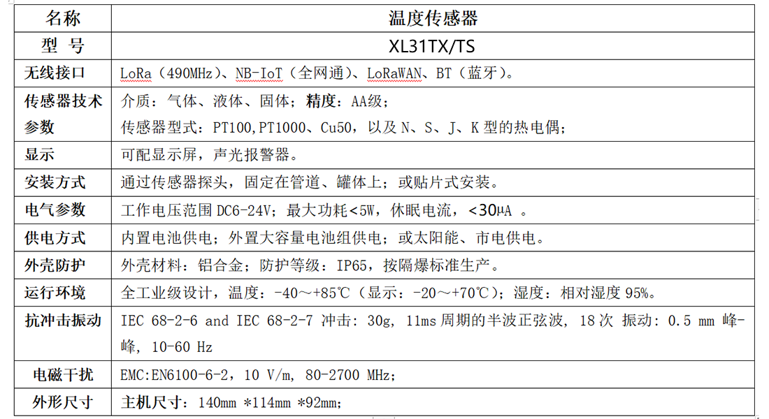 XL31TX/TS智能溫度傳感器,集成傳感元件、信息處理、無線通訊、電池供電等于一體。通訊中斷保存數(shù)據(jù),通訊恢復(fù)重傳數(shù)據(jù),超限主動上傳數(shù)據(jù),電池能量低上傳報警數(shù)據(jù)。