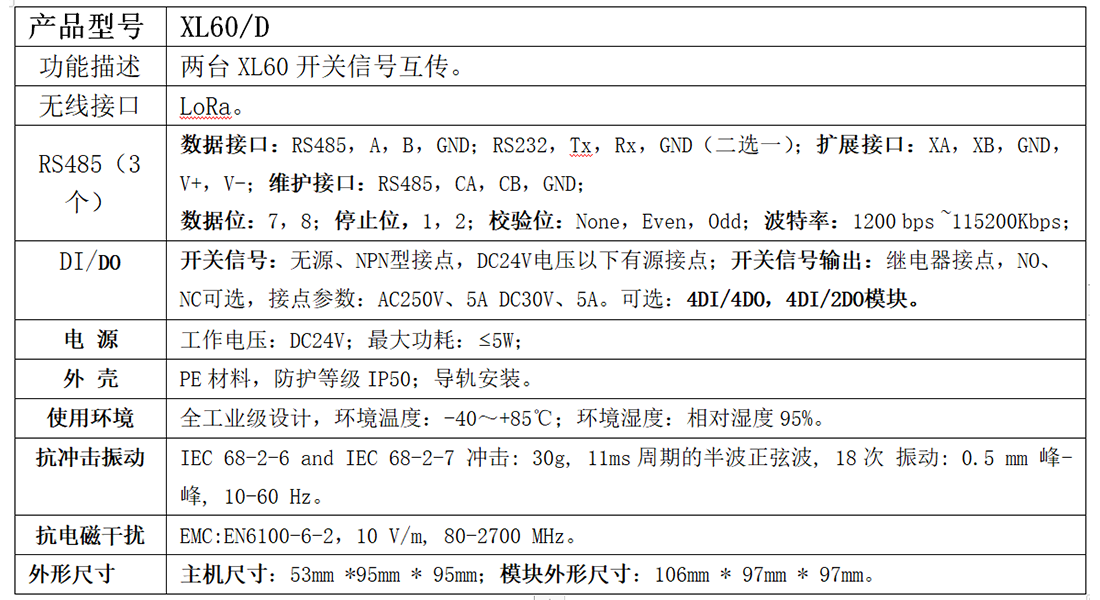 XL60D的通信方式是LoRa無線傳輸方式,每臺XL60D主機模塊,最多配兩個開關(guān)量I/O模塊。
