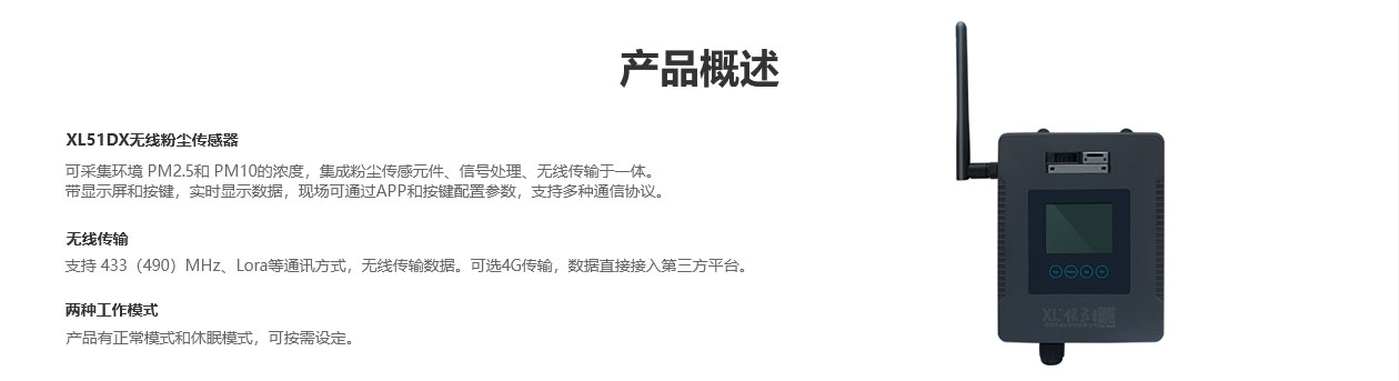 XL51DX無線粉塵傳感器,可采集環(huán)境 PM2.5和 PM10的濃度,集成粉塵傳感元件、信號處理、無線傳輸于一體。帶顯示屏和按鍵,實時顯示數(shù)據(jù),現(xiàn)場可通過APP和按鍵配置參數(shù),支持多種通信協(xié)議。