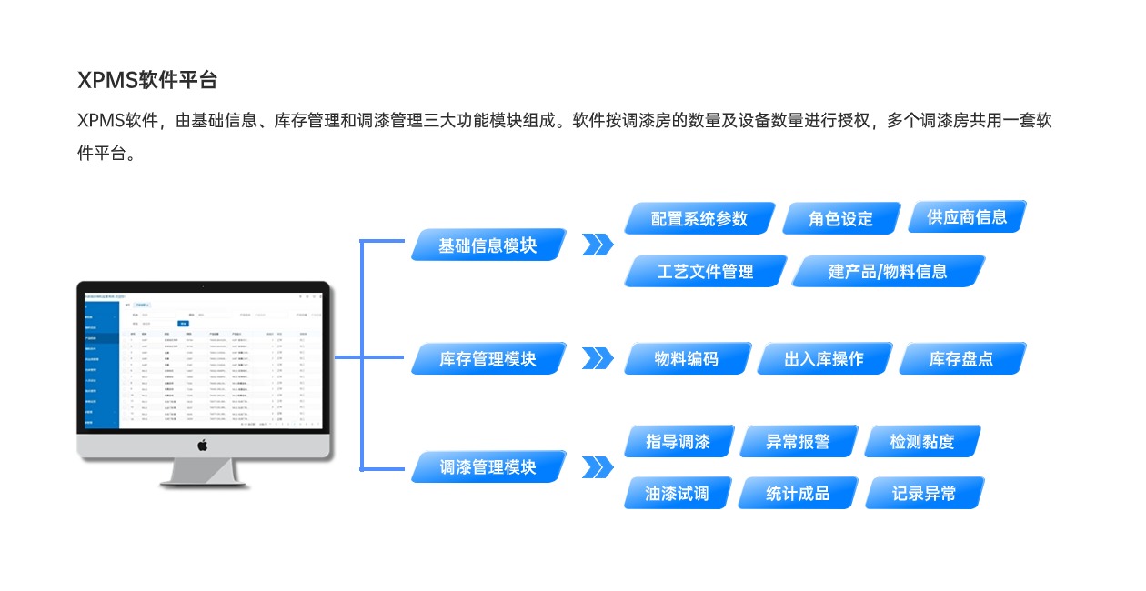 信立調(diào)漆管控系統(tǒng)XPMS,應(yīng)用工業(yè)物聯(lián)網(wǎng)技術(shù)、數(shù)據(jù)庫及智能化平臺軟件,標(biāo)準(zhǔn)、規(guī)范、指導(dǎo)、監(jiān)管調(diào)漆過程,實(shí)現(xiàn)調(diào)漆操作智能化、簡單化,有效提升調(diào)漆質(zhì)量、減少漆料浪費(fèi),降低人為因素風(fēng)險(xiǎn),是一套智能化的調(diào)漆、制漆管控系統(tǒng)。