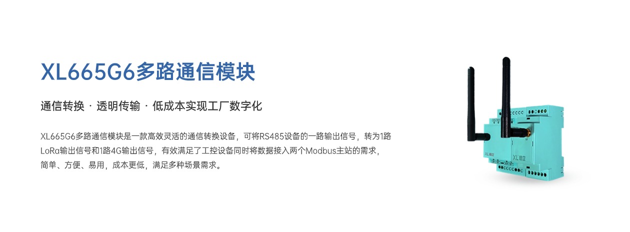 XL665G6多路通信模塊是一款高效靈活的通信轉(zhuǎn)換設備,可將RS485設備的一路輸出信號,轉(zhuǎn)為1路LoRa輸出信號和1路4G輸出信號,有效滿足了工控設備同時將數(shù)據(jù)接入兩個Modbus主站的需求,簡單、方便、易用,成本更低,滿足多種場景需求。