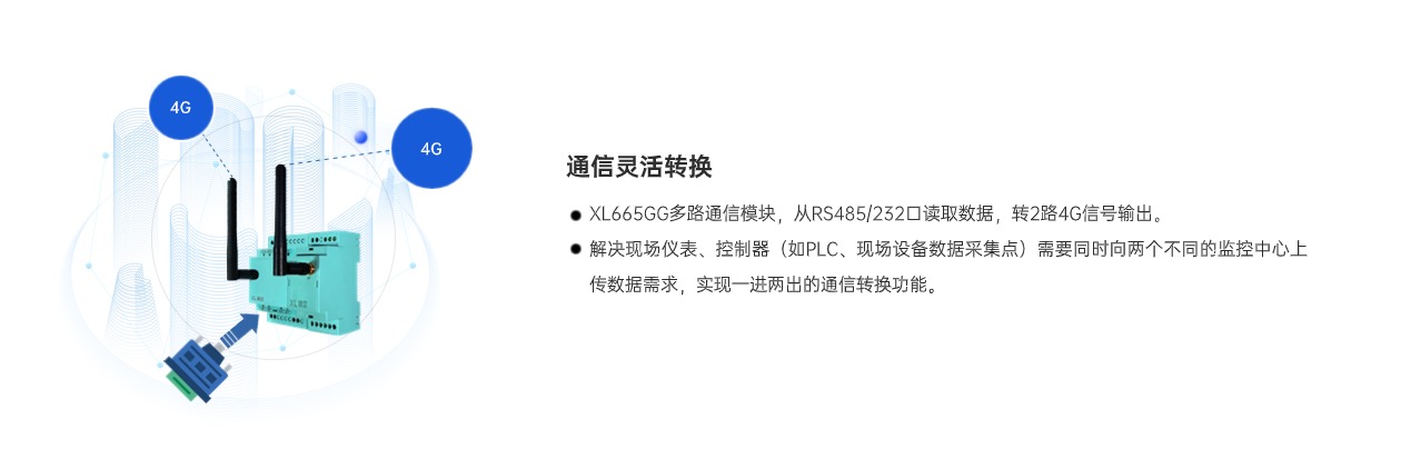 XL665GG多路通信模塊是一款高效靈活的通信轉(zhuǎn)換設(shè)備,可將RS485設(shè)備的一路輸出信號(hào),轉(zhuǎn)為2路4G輸出信號(hào),有效滿足了工控設(shè)備同時(shí)將數(shù)據(jù)接入兩個(gè)Modbus主站的需求,簡單、方便、易用,成本更低,滿足多種場(chǎng)景需求。