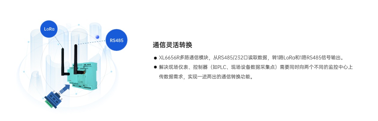 XL6656R多路通信模塊是一款高效靈活的通信轉(zhuǎn)換設(shè)備,可將RS485設(shè)備的一路輸出信號,轉(zhuǎn)為1路LoRa和1路RS485輸出信號,有效滿足了工控設(shè)備同時(shí)將數(shù)據(jù)接入兩個(gè)Modbus主站的需求,簡單、方便、易用,成本更低,滿足多種場景需求。