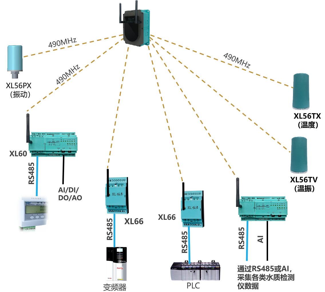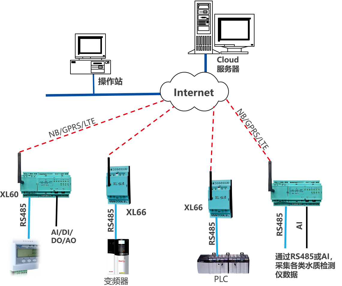 類似泵房、水廠、水源井等場所的數(shù)據(jù)監(jiān)測,監(jiān)測點(diǎn)的數(shù)據(jù)先上傳至XL90物聯(lián)網(wǎng)關(guān),再通過NB/GPRS/LTE轉(zhuǎn)發(fā)數(shù)據(jù)至云平臺,此種情況,數(shù)以后在量大時(shí),可選LTE(4g)方式
