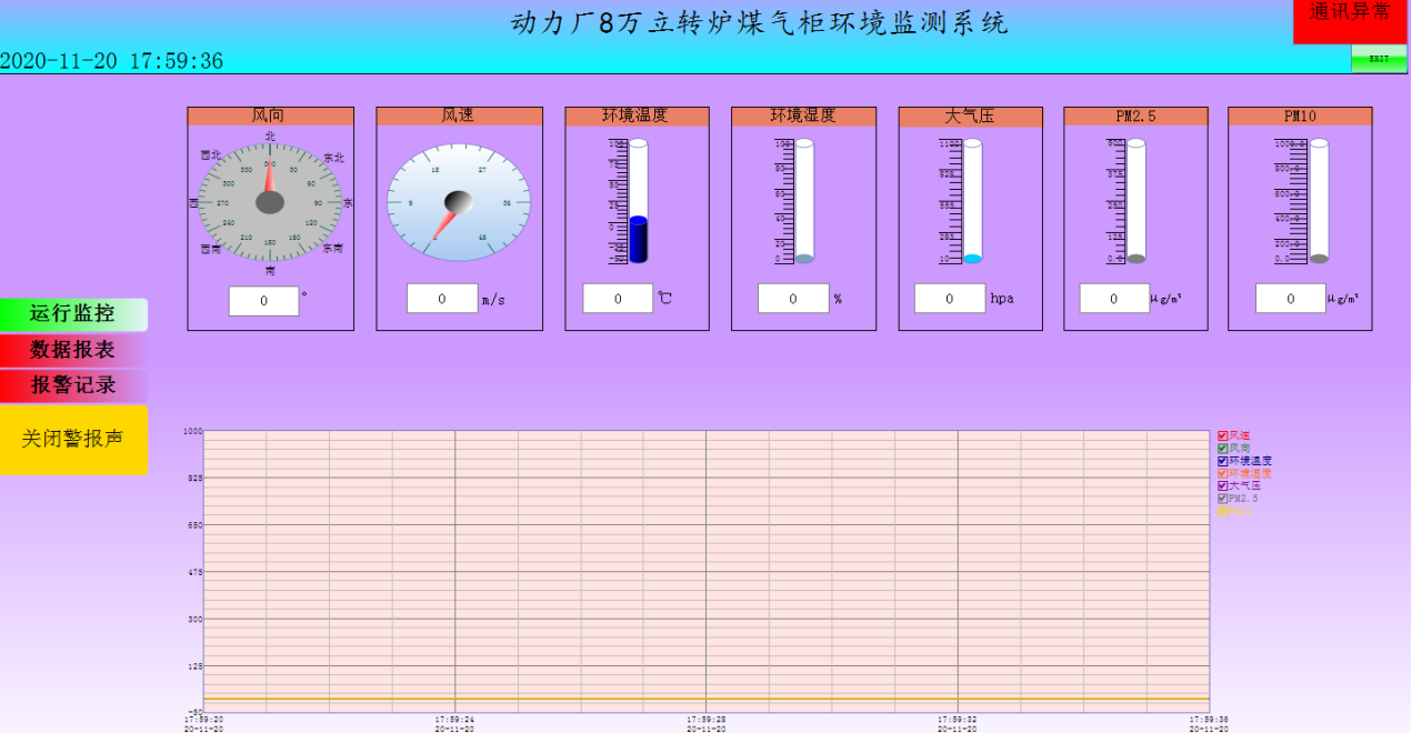 通過無線傳輸,實(shí)時(shí)監(jiān)測轉(zhuǎn)爐煤氣柜的周邊環(huán)境情況,包括:溫濕度、風(fēng)速風(fēng)向、大氣壓力、PM2.5及PM10,并在PC界面顯示出來。