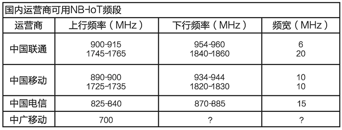 NB-IoT使用了授權(quán)頻段,有三種部署方式:獨(dú)立部署、保護(hù)帶部署、帶內(nèi)部署。全球主流的頻段是800MHz和900MHz。中國電信會把NB-IoT部署在800MHz頻段上,而中國聯(lián)通會選擇900MHz來部署NB-IoT,中國移動則可能會重耕現(xiàn)有900MHz頻段。具體如表所示: