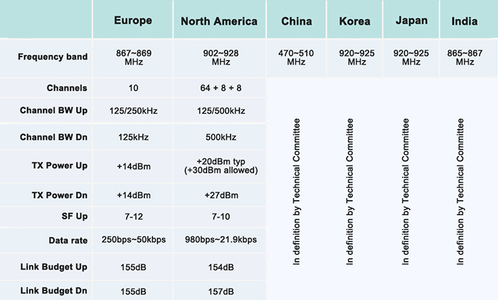 LoRa使用的是免授權(quán)ISM頻段,但各國或地區(qū)的ISM頻段使用情況是不同的。在中國市場,由中興主導(dǎo)的中國LoRa應(yīng)用聯(lián)盟(CLAA)推薦使用了470-518MHz。而470-510MHz這個頻段是無線電計量儀表使用頻段。由于LoRa是工作在免授權(quán)頻段的,無需申請即可進(jìn)行網(wǎng)絡(luò)的建設(shè),網(wǎng)絡(luò)架構(gòu)簡單,運(yùn)營成本也低。LoRa聯(lián)盟正在全球大力推進(jìn)標(biāo)準(zhǔn)化的LoRaWAN協(xié)議,使得符合LoRaWAN規(guī)范的設(shè)備可以互聯(lián)互通。下圖是LoRa聯(lián)盟規(guī)范里提到的部分使用頻段: