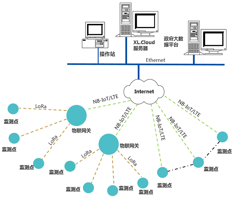 監(jiān)測(cè)點(diǎn)的數(shù)據(jù),通過LoRa上傳匯聚到物聯(lián)網(wǎng)關(guān),物聯(lián)網(wǎng)關(guān)再通過NB/4G,上傳至監(jiān)控服務(wù)器;應(yīng)用于一臺(tái)設(shè)備,或一套系統(tǒng),有多個(gè)監(jiān)測(cè)點(diǎn),安裝距離較近,集成在一臺(tái)網(wǎng)關(guān)內(nèi)上傳,更便于配置、維護(hù)、管理。