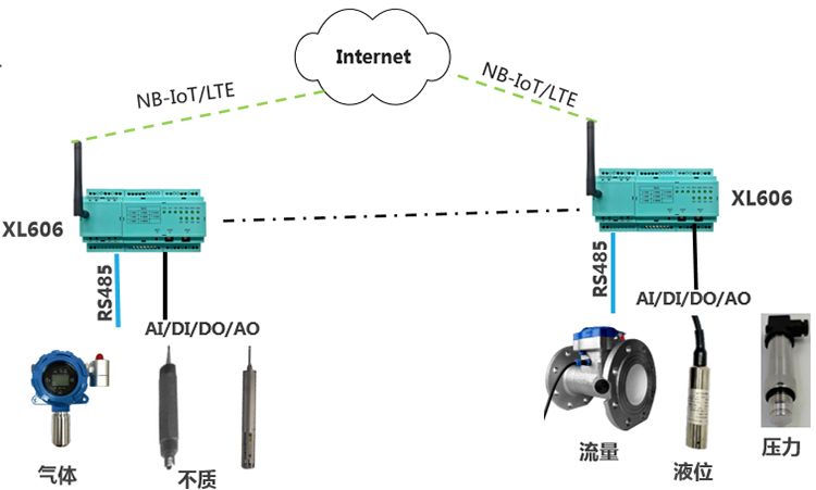 選擇XL60主機(jī)模塊,加I/O模塊,采集排放數(shù)據(jù),通過NB/4G上傳至監(jiān)控中心服務(wù)器,由于NB網(wǎng)絡(luò)覆蓋地域有限,建議選擇4G通信方式,資費(fèi)差別不大;