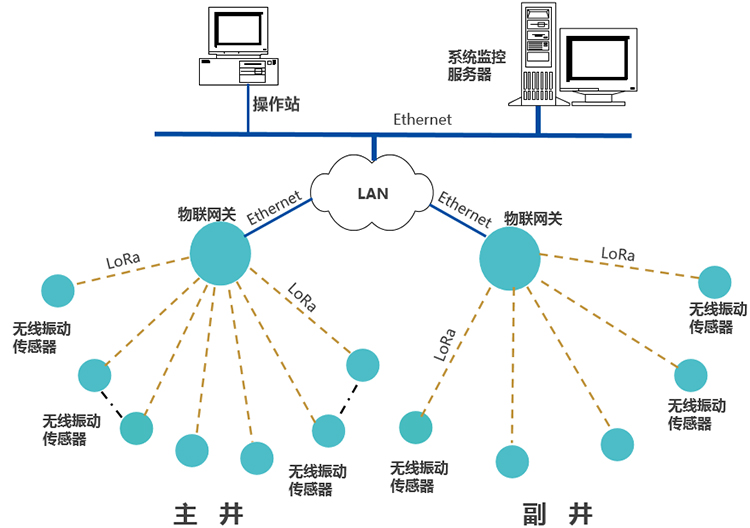在主井、副井各安裝1臺(tái)物聯(lián)網(wǎng)關(guān),無(wú)線讀取振動(dòng)傳感器的數(shù)據(jù),通過(guò)LAN(局域網(wǎng)),上專數(shù)據(jù)到監(jiān)控服務(wù)器;
