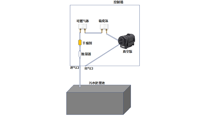 過程:用聚四氟乙烯管,聯(lián)接整個氣體通路。管直接伸入污水池,聯(lián)接控制箱進氣口,氣體從進氣口,至過濾器、除濕器,至傳感器探頭進、出氣口(兩臺傳感器的進、出氣口串聯(lián)),至真空泵抽氣口,從真空泵排氣口聯(lián)接控制箱出氣口;