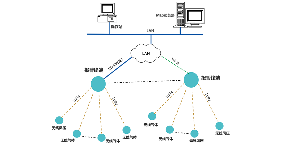 報(bào)警終端無(wú)線讀取監(jiān)測(cè)點(diǎn)上傳的數(shù)據(jù),進(jìn)行處理、顯示、報(bào)警;并將數(shù)據(jù)通過(guò)局域網(wǎng),MQTT協(xié)議,上傳至MES。