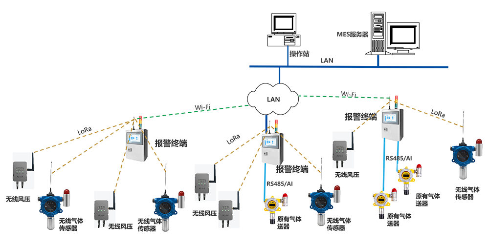 原有的氣體傳感器,通過(guò)有線方式接入分布安裝的報(bào)警終端;支持RS485、DC4-20mA、DC0-5V、Ethernet等方式接入。