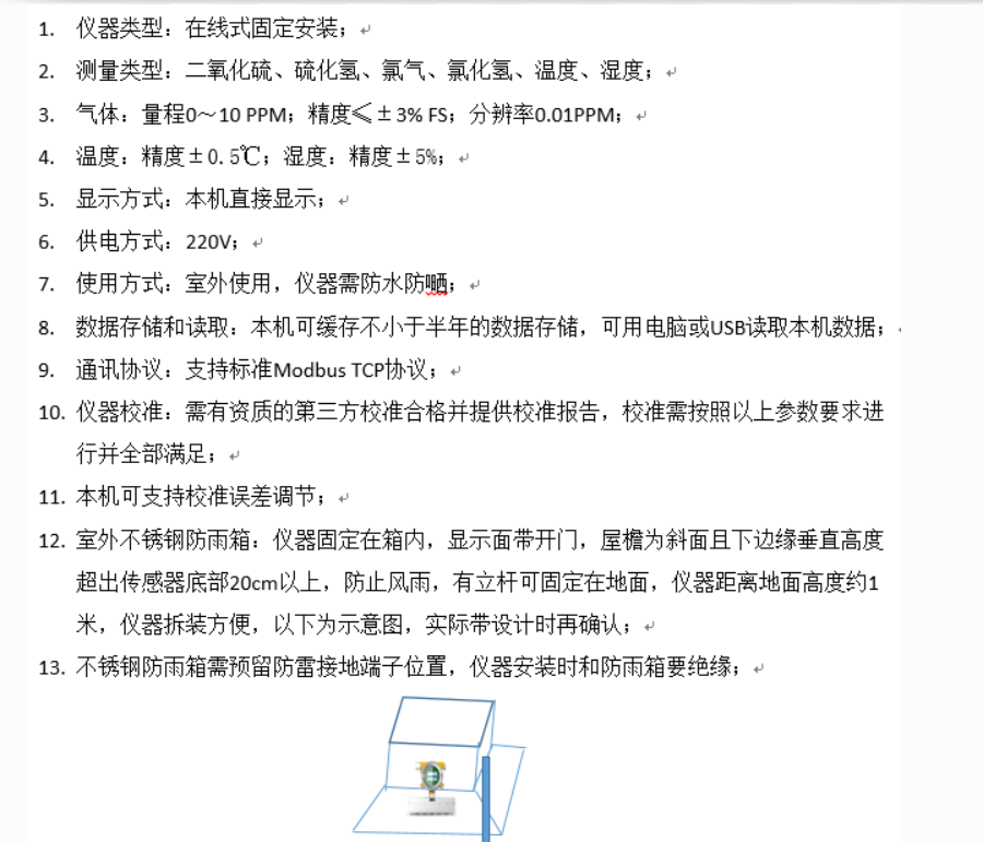 戶外箱體配置:建議選擇1套玻璃鋼百葉箱,安裝XL68環(huán)境監(jiān)測終端及傳感器探頭。建議選擇尺寸足夠的標準產(chǎn)品。