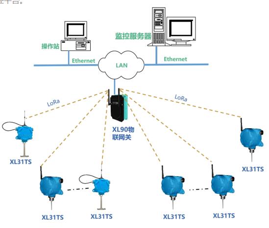 無線接收端選擇XL90物聯(lián)網(wǎng)關(guān),物聯(lián)網(wǎng)關(guān)無線讀取溫度傳感器的數(shù)據(jù),進(jìn)行處理、協(xié)議轉(zhuǎn)換,通過Ethernet上傳數(shù)據(jù)至監(jiān)控服務(wù)器,或接入DCS等其它監(jiān)控平臺(tái)。