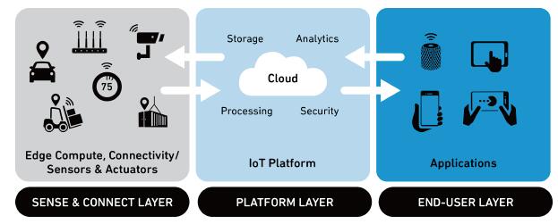 物聯(lián)網(wǎng)大致分為3 層。第1 層為感知和連接層,用于將物聯(lián)網(wǎng)硬件連接到執(zhí)行數(shù)據(jù)處理和存儲(chǔ)的網(wǎng)絡(luò)應(yīng)用。第2 層為平臺(tái)層,用于保護(hù)、處理、分析和存儲(chǔ)數(shù)據(jù)。第3層為最終用戶層,最終用戶在此使用應(yīng)用監(jiān)控并解讀數(shù)據(jù)。此外,最終用戶還可以使用應(yīng)用發(fā)送指令。