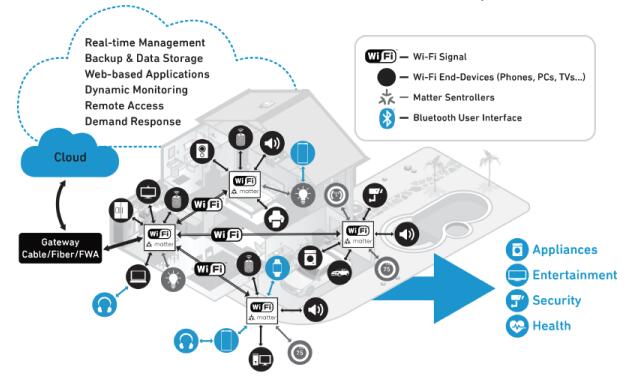Matter有助于消費(fèi)類物聯(lián)網(wǎng)互聯(lián)生態(tài)系統(tǒng)輕松實(shí)現(xiàn)即插即用,從而簡化智能家居和智能辦公環(huán)境。它在互聯(lián)網(wǎng)協(xié)議之上提供一個(gè)層,其中包括一組適用于所有Matter連接設(shè)備的預(yù)定義方案。這使得 Matter 設(shè)備能夠了解它們正在與什么類型的對(duì)象進(jìn)行通信,以及這些對(duì)象有什么樣的功能。Matter 使物聯(lián)網(wǎng)終端設(shè)備或節(jié)點(diǎn)能夠與各種 Wi-Fi 網(wǎng)絡(luò) pod 輕松通信。