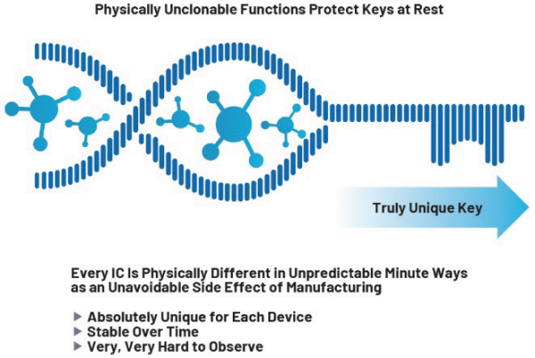 不幸的是,由于直接探測會試圖監(jiān)視微電路的內(nèi)部結(jié)構(gòu),因此通用微控制器中常用的存儲器技術(shù)(即 EEPROM或閃存)并不安全。利用掃描電子顯微鏡(SEM),攻擊者無需很高成本,即可直接監(jiān)視存儲器的內(nèi)容。為了降低此風(fēng)險,半導(dǎo)體行業(yè)開發(fā)了“物理不可克隆功能”(PUF) 技術(shù)。PUF 用來從微電路的固有物理屬性中導(dǎo)出唯一密鑰。這些因芯片而異的屬性很難直接探測,因此難以通過直接探測提取生成的密鑰。在一些情況下,PUF派生密鑰會對信任根內(nèi)部存儲器的其余部分進行加密,從而保護設(shè)備上存儲的所有其他密鑰和憑據(jù)。