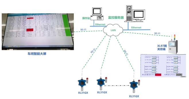 采用無線通信方式,同時在多個位置設(shè)置監(jiān)視及聲光報警點(diǎn),例如可在危險環(huán)境空間入口、值班室設(shè)置數(shù)據(jù)監(jiān)視及聲光報警點(diǎn),在車間、工廠大屏上實時顯示有毒有害氣體濃度數(shù)據(jù)。