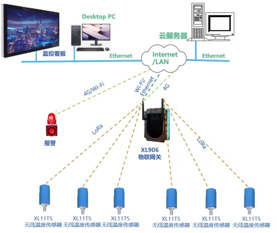 XL11TS無(wú)線溫度傳感器等采集節(jié)點(diǎn),通過LoRa無(wú)線傳輸技術(shù)將溫度數(shù)據(jù)傳輸至XL906網(wǎng)關(guān);