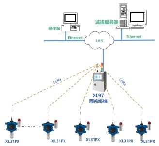 可配XL97網關終端,增加現(xiàn)場集中監(jiān)視,讀取區(qū)域內壓力傳感器數(shù)據(jù),分析處理、顯示、報警,并轉發(fā)至監(jiān)控中心服務器。