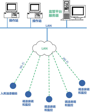 涂裝油漆調(diào)和監(jiān)管系統(tǒng),由監(jiān)管平臺(tái)服務(wù)器、油漆調(diào)和操作監(jiān)控終端、電子秤、油漆編碼終端、操作站等構(gòu)成,通過(guò)工廠(chǎng)內(nèi)的局域網(wǎng)(WI-FI)進(jìn)行通信連接。
