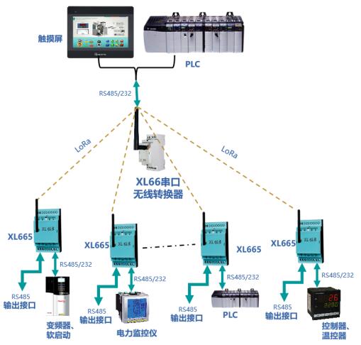 通過(guò)LoRa無(wú)線傳輸模塊輸出的數(shù)據(jù),可上傳至XL90物聯(lián)網(wǎng)關(guān)接入監(jiān)控軟件平臺(tái),或通過(guò)XL66串口無(wú)線轉(zhuǎn)換器,與PLC、觸摸屏等通信。