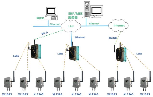XL13AS 無(wú)線風(fēng)管風(fēng)速傳感器通過(guò) LoRa 無(wú)線傳輸方式,將數(shù)據(jù)上傳至 XL906 物聯(lián)網(wǎng)關(guān) ,網(wǎng)關(guān)可選以太網(wǎng)、 Wi-Fi 、 4G 通信方式,推送數(shù)據(jù)至監(jiān)管平臺(tái)、企業(yè)生產(chǎn)管控服務(wù)器等。