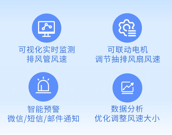 根據(jù)現(xiàn)場(chǎng)需求,可聯(lián)動(dòng)電機(jī),當(dāng)風(fēng)速過(guò)小或者過(guò)大,自動(dòng)調(diào)節(jié)抽排風(fēng)扇的轉(zhuǎn)速,以保持排氣管道內(nèi)的風(fēng)速控制在合適范圍內(nèi)。