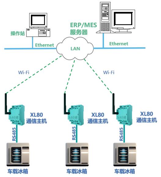 綜合考慮現(xiàn)場監(jiān)測需求,選用 XL802 通信主機(jī) ,通過 RS485 采集冰箱壓縮機(jī)、加熱塊、風(fēng)扇等部件的電壓、電流等電氣參數(shù),進(jìn)行 協(xié)議轉(zhuǎn)換 并 無線遠(yuǎn)傳 ??赏ㄟ^ XBUS 總線, 擴(kuò)展信號輸入、輸出模塊 ,滿足現(xiàn)場較多參數(shù)采集的情況。