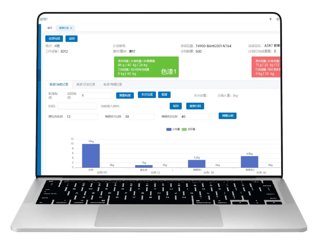 當(dāng)某種原料倒入過多,系統(tǒng)彈窗報(bào)警,經(jīng)上級(jí)權(quán)限確認(rèn)后系統(tǒng)根據(jù)給定配比,自動(dòng)更新各原料所需重量。整個(gè)調(diào)漆過程,操作員只需遵循系統(tǒng)操作流程倒入原料,大大降低調(diào)漆人員準(zhǔn)入門檻,打破傳統(tǒng)依賴經(jīng)驗(yàn)的調(diào)漆模式。