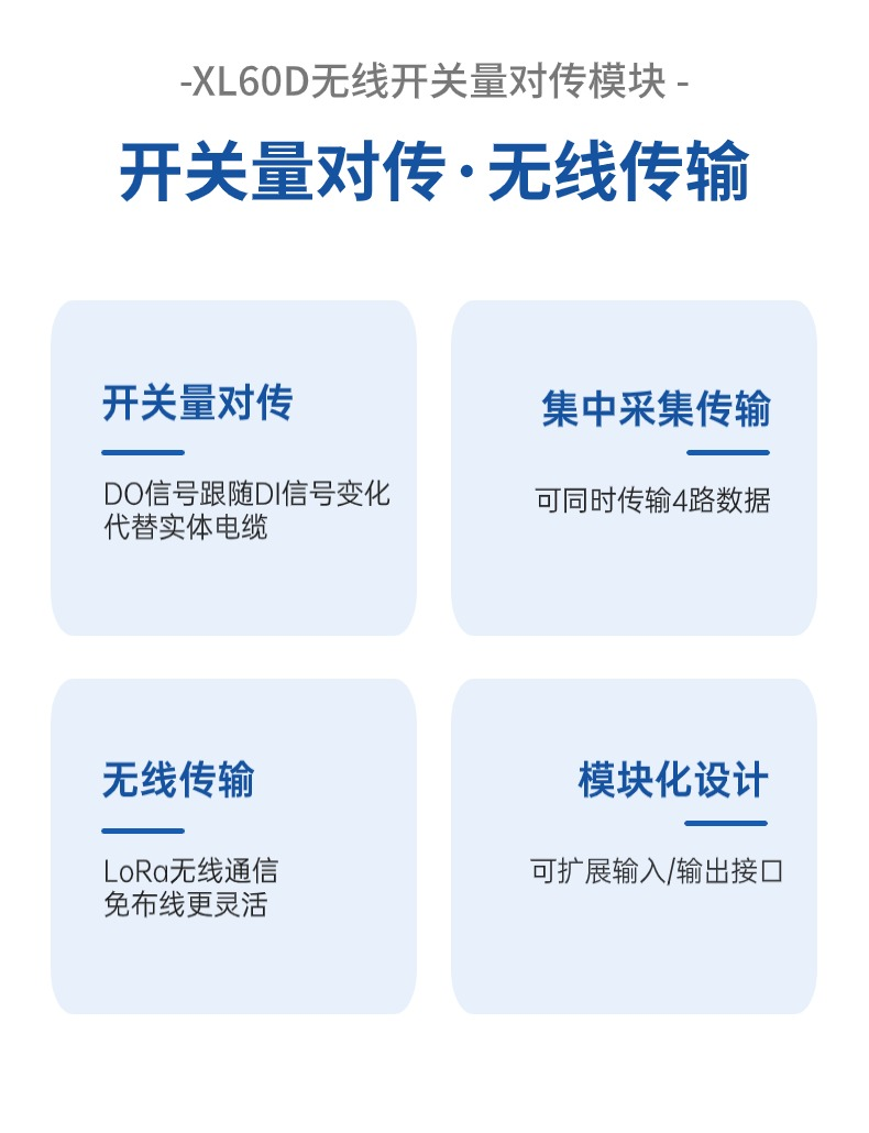 選擇XL60D無(wú)線(xiàn)開(kāi)關(guān)量對(duì)傳模塊,接收控制儀表的開(kāi)關(guān)量信號(hào)、輸出開(kāi)關(guān)量信號(hào)控制生產(chǎn)設(shè)備啟停。