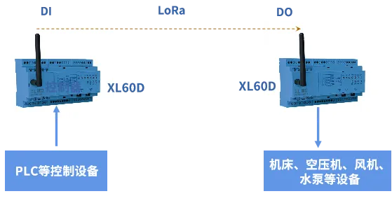 一對(duì)XL60D無(wú)線(xiàn)開(kāi)關(guān)量對(duì)傳模塊,其中一臺(tái)與PLC等控制儀表連接,作信號(hào)發(fā)射端;一臺(tái)配置在生產(chǎn)現(xiàn)場(chǎng),作信號(hào)接收端。發(fā)射端的XL60D將控制儀表的啟停命令,通過(guò)LoRa無(wú)線(xiàn)對(duì)傳到接收端,接收端的XL60D輸出開(kāi)關(guān)量信號(hào),控制設(shè)備啟、停。