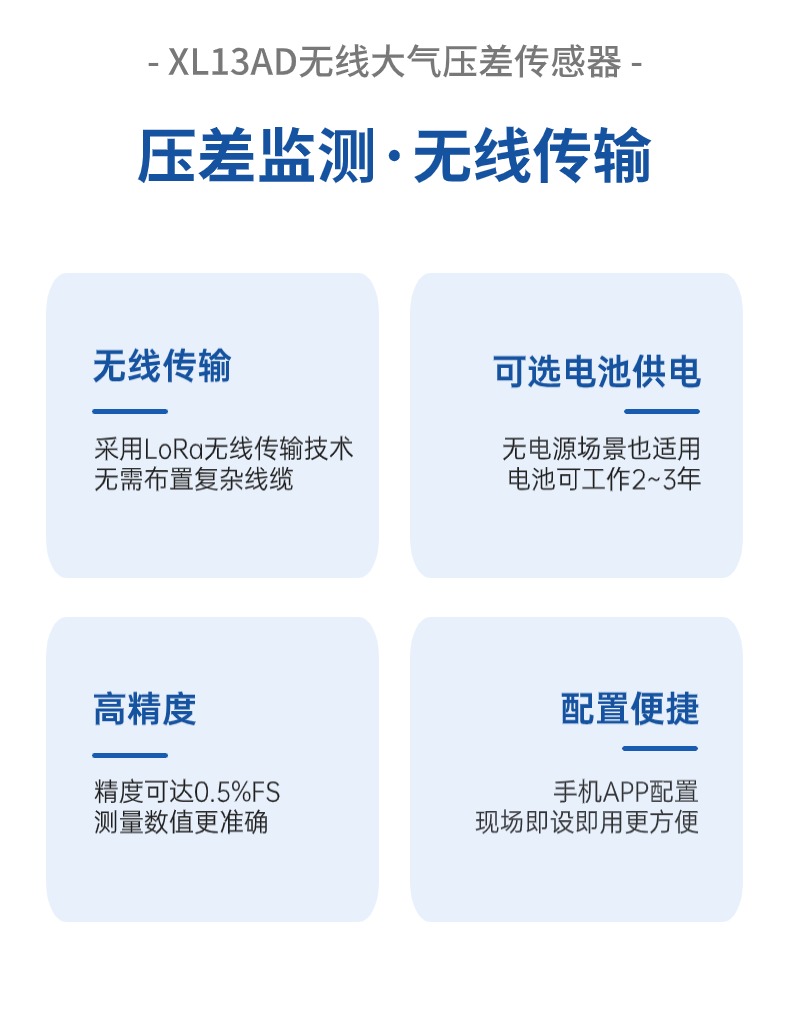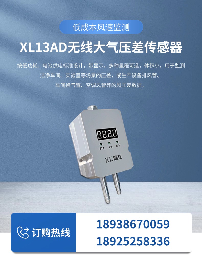 選用XL13AD無線壓差傳感器,部署于潔凈區(qū)邊界、動態(tài)風險點等關鍵點,實時監(jiān)測壓差,并聯(lián)動回風管或排風管上的電動調(diào)節(jié)閥,當壓差異常時自動調(diào)節(jié)送/排風量。